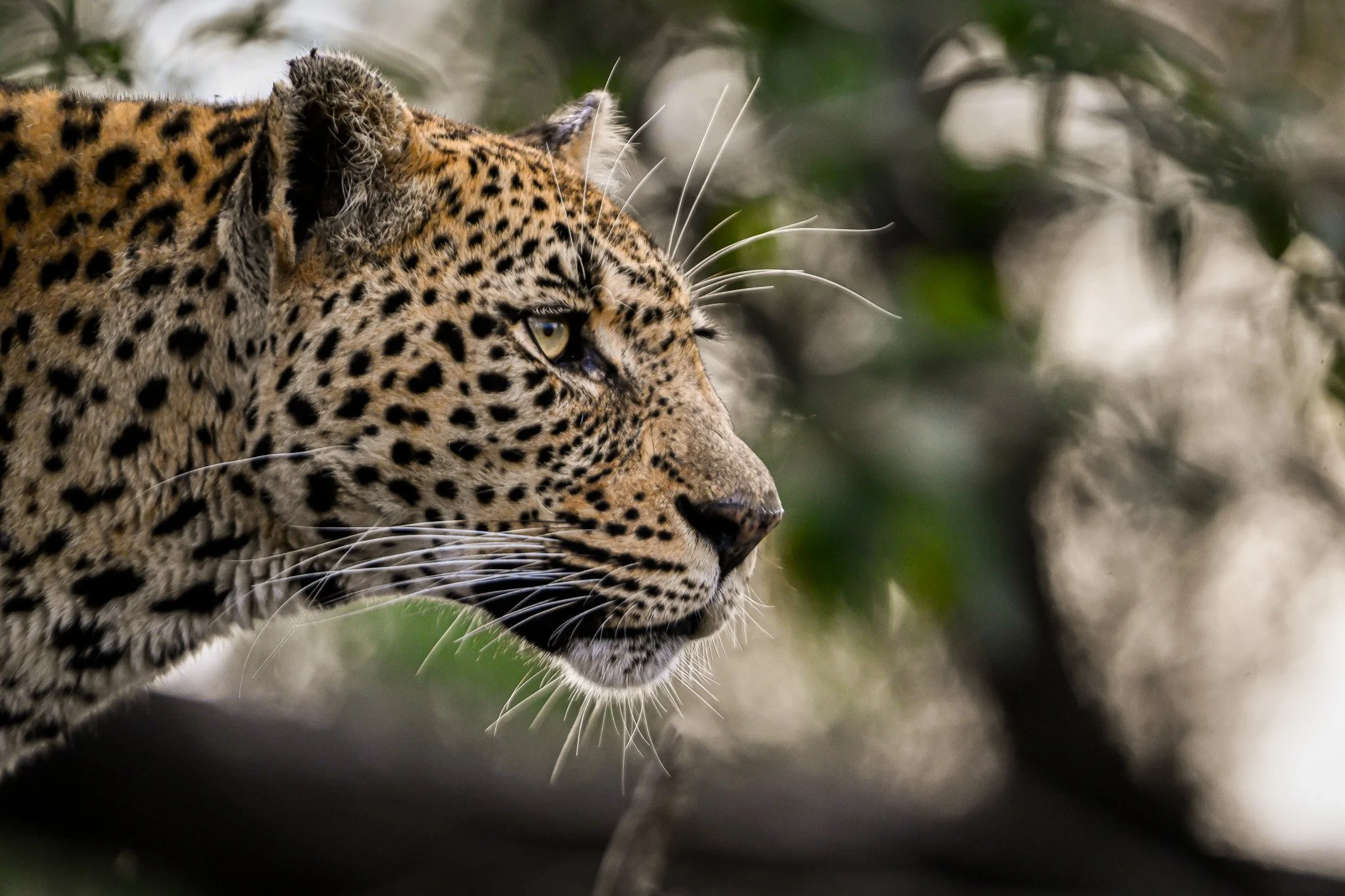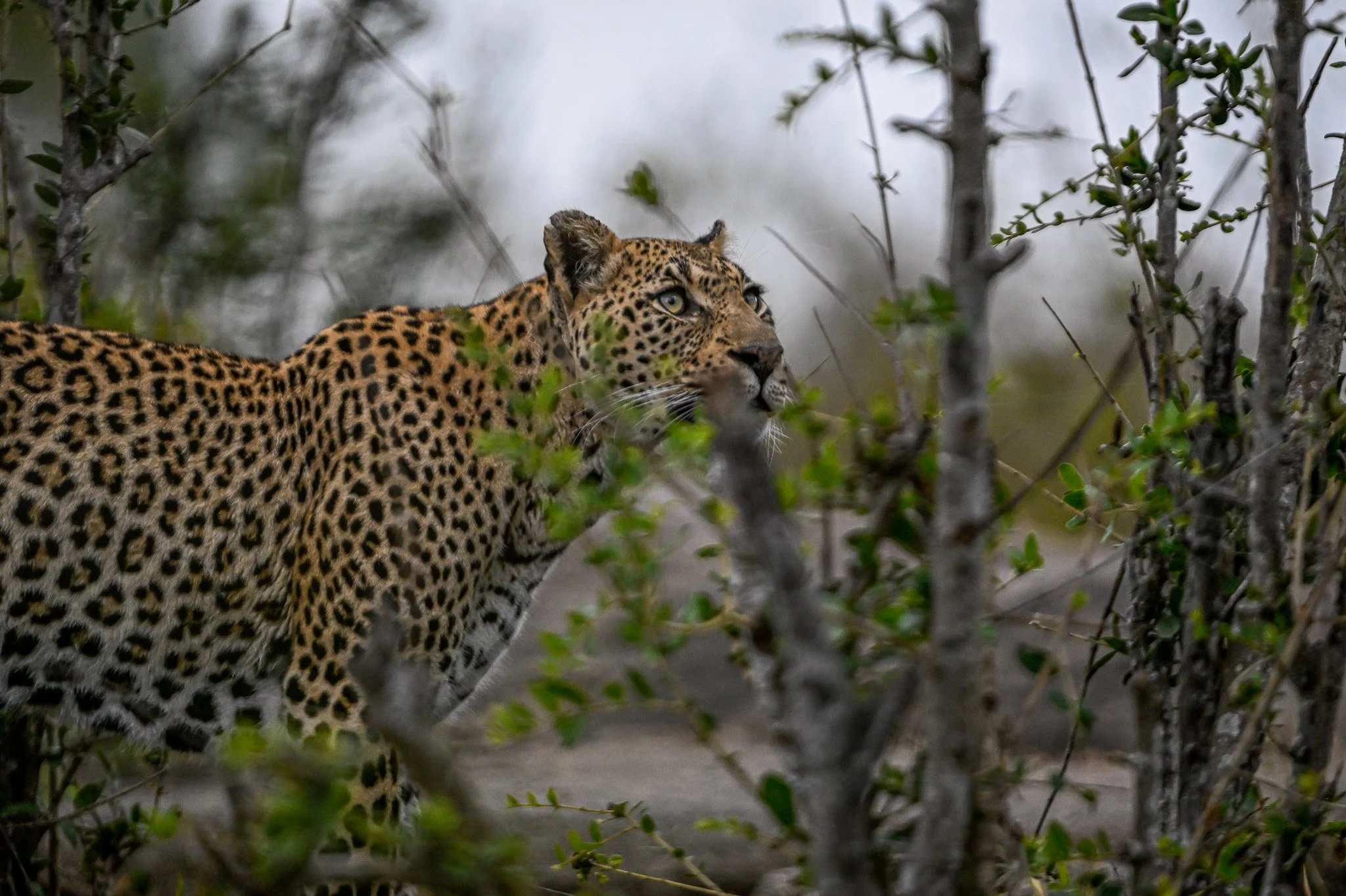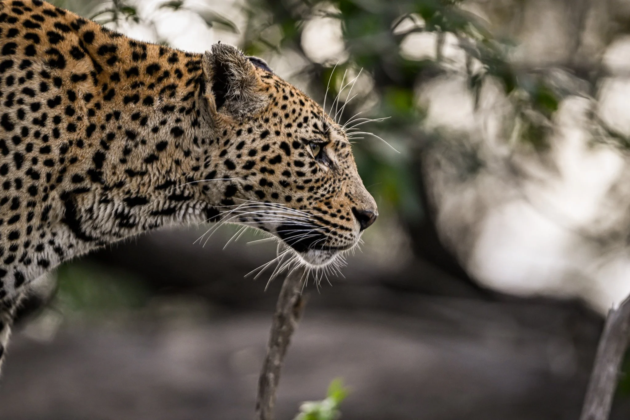Unfortunately, only about one-fifth of leopard cubs make it to adulthood in this area. Knowing this, we sat in the Land Rover without a sound as the grieving mother continued to cry out, wandering out of the den site and through the woodland trees. She briefly stopped at a branch, catching her breath and stretching her legs before continuing. Something told me she wasn’t ready to give up just yet.