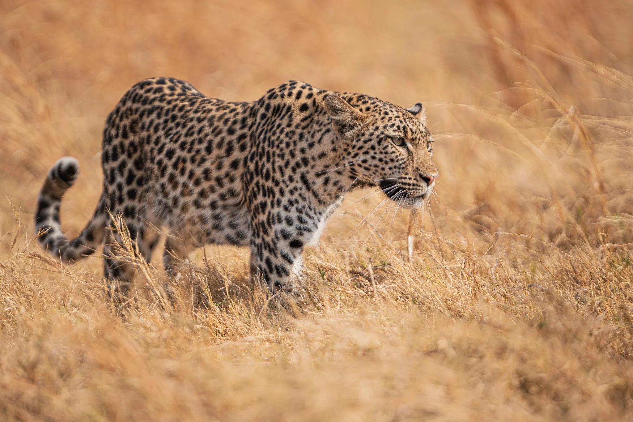 This young female is striding confidently through the tall grass, when all of a sudden she slows and lowers herself to the ground. She has spotted a herd of impala in the distance. Leopards are opportunistic hunters, and will feast on everything from rodents and birds to their preferred antelope.
