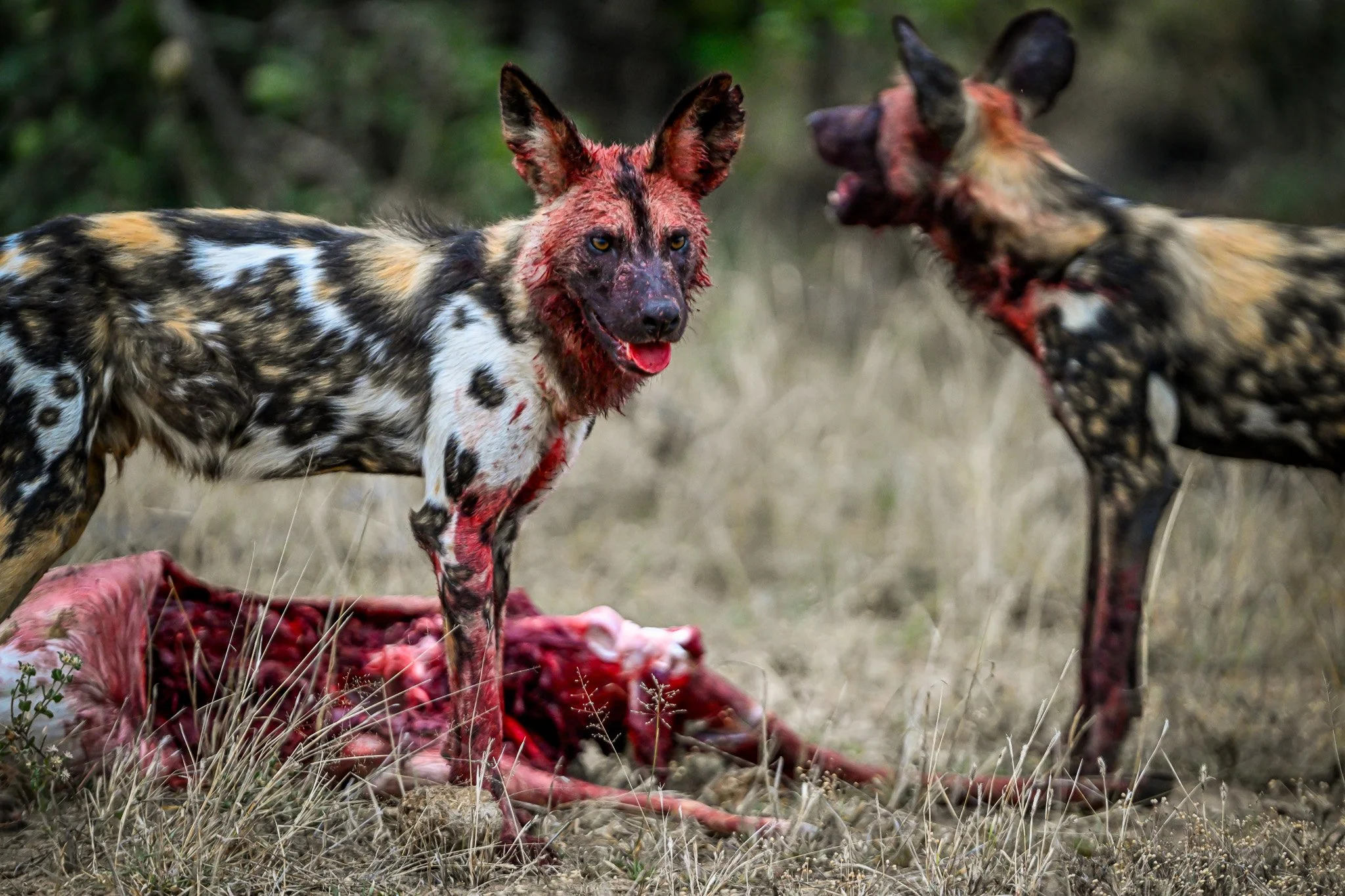 Once these two individuals had worked their way through half the carcass, they were full. They lick their lips and jog together, leaving the messy carcass behind. They are off to find the others and bring them back to feed on the defeated impala.